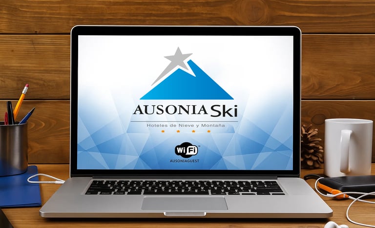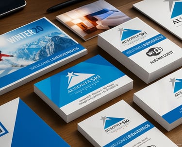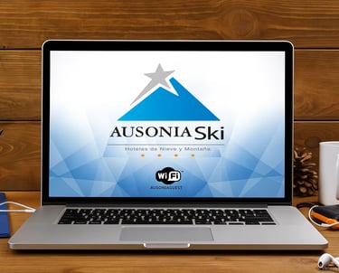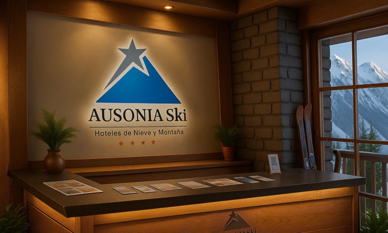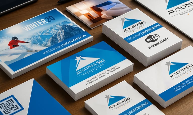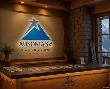 Identidad para Ausonia Ski, cadena de hoteles de nieve y montaña en la cordillera patagóica argentina. El isologo combina la silueta de una cumbre nevada en azul degradado con una estrella que marca el destino, reforzada por la tipografía clásica y las cuatro estrellas del sistema hotelero. El conjunto transmite naturaleza, sofisticación y confort, con una lectura clara en señalética.