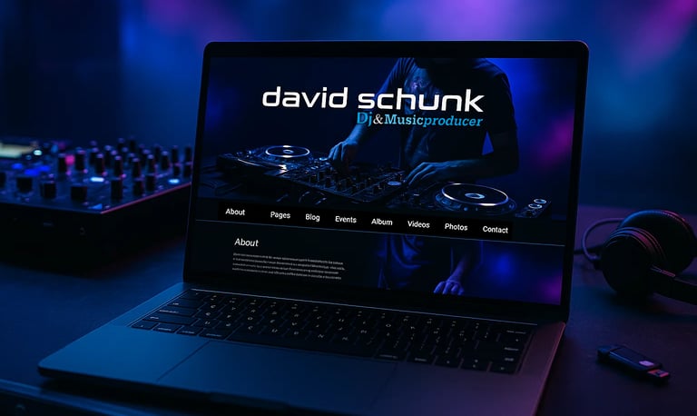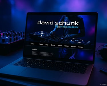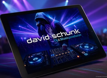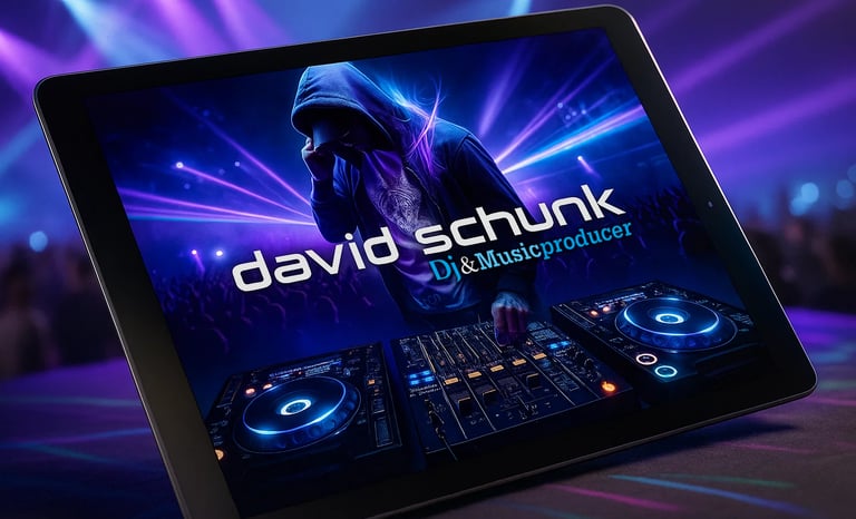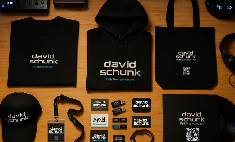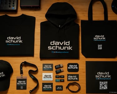 Identidad visual y web para David Schunk, DJ y productor de música electrónica. Se definió una identidad tipográfica limpia y contemporánea en blanco, con un detalle cromático en cian como rasgo distintivo, aplicada en portadas, merchandising y piezas digitales. La web, de estética oscura con acentos neón, integra biografía, discografía y enlaces a plataformas de streaming, reforzando su presencia profesional como artista.