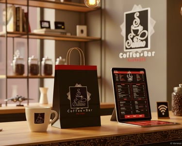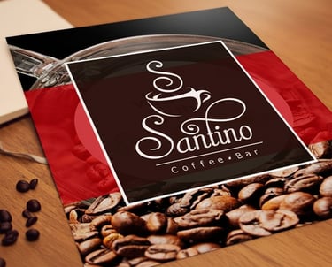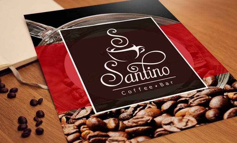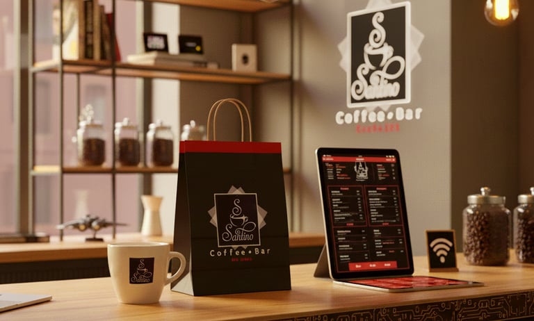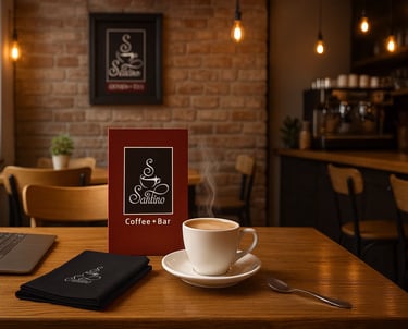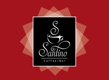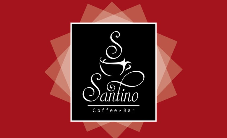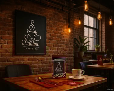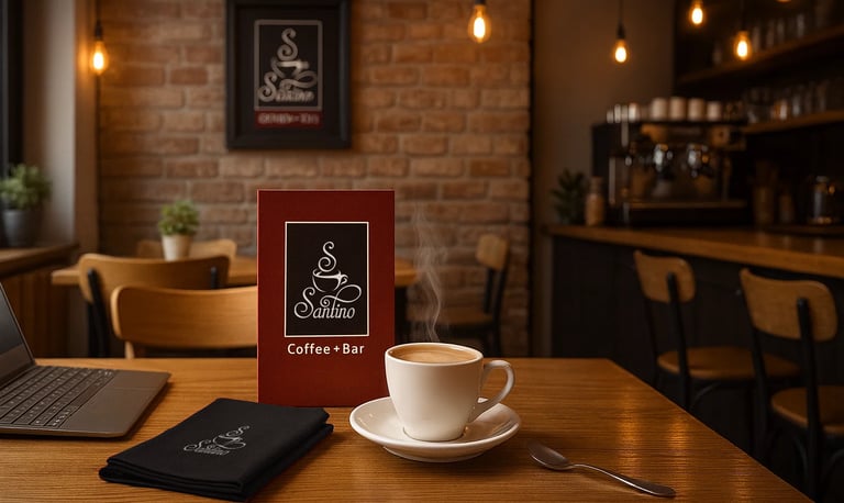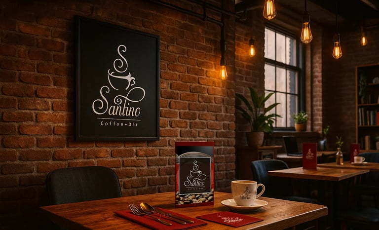 Identidad visual para Santino Coffee·Bar, una cafetería moderna de estilo industrial y ambiente cálido y familiar. El logotipo combina caligrafía fluida y acentos en rojo carmesí sobre negro, transmitiendo carácter y cercanía. El sistema visual se aplica en menús, tazas, packaging y señalética, creando una experiencia acogedora y coherente en todo el espacio.