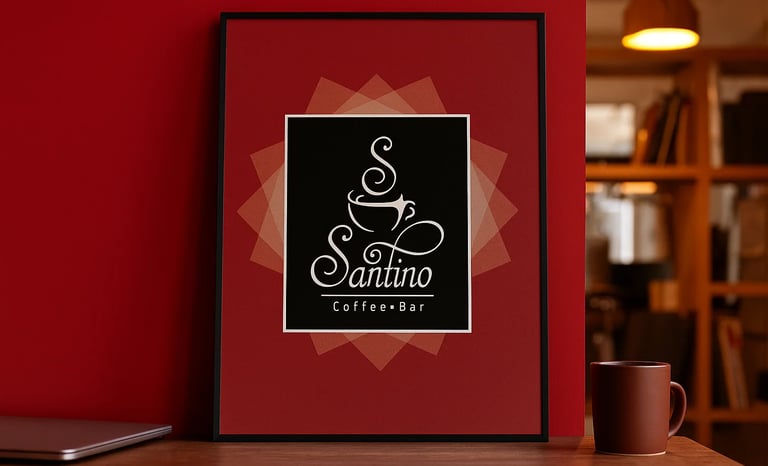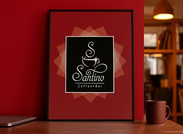 Identidad visual para Santino Coffee·Bar, una cafetería moderna de estilo industrial y ambiente cálido y familiar. El logotipo combina caligrafía fluida y acentos en rojo carmesí sobre negro, transmitiendo carácter y cercanía. El sistema visual se aplica en menús, tazas, packaging y señalética, creando una experiencia acogedora y coherente en todo el espacio.